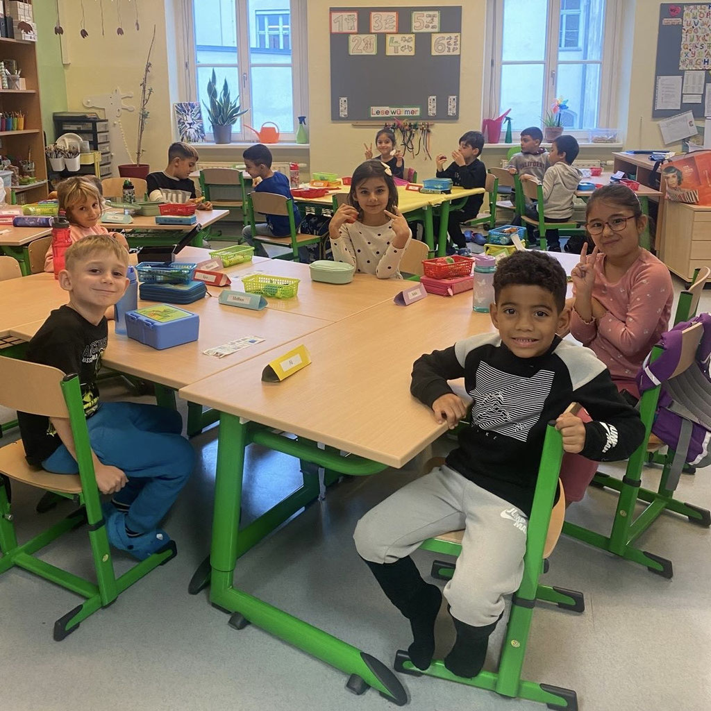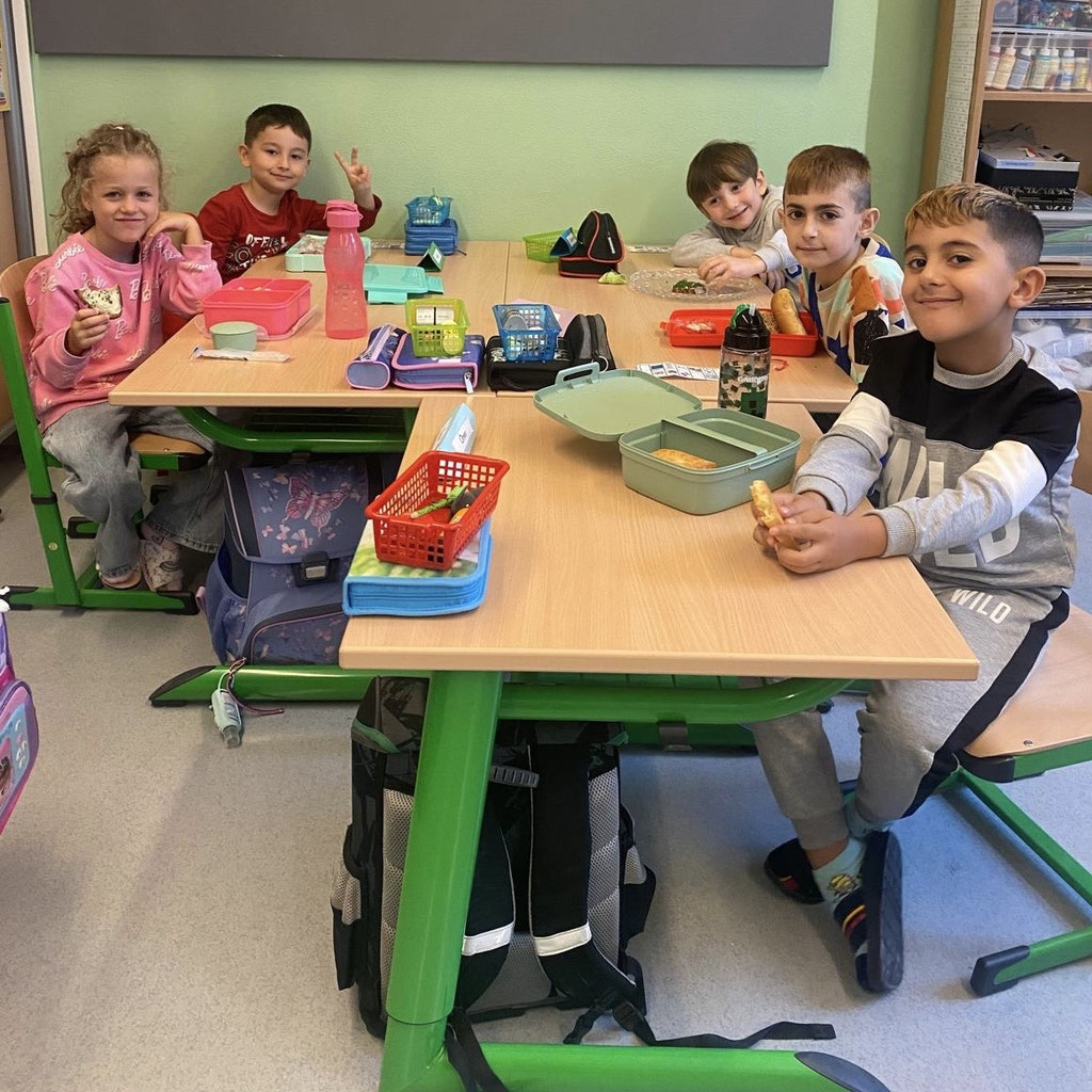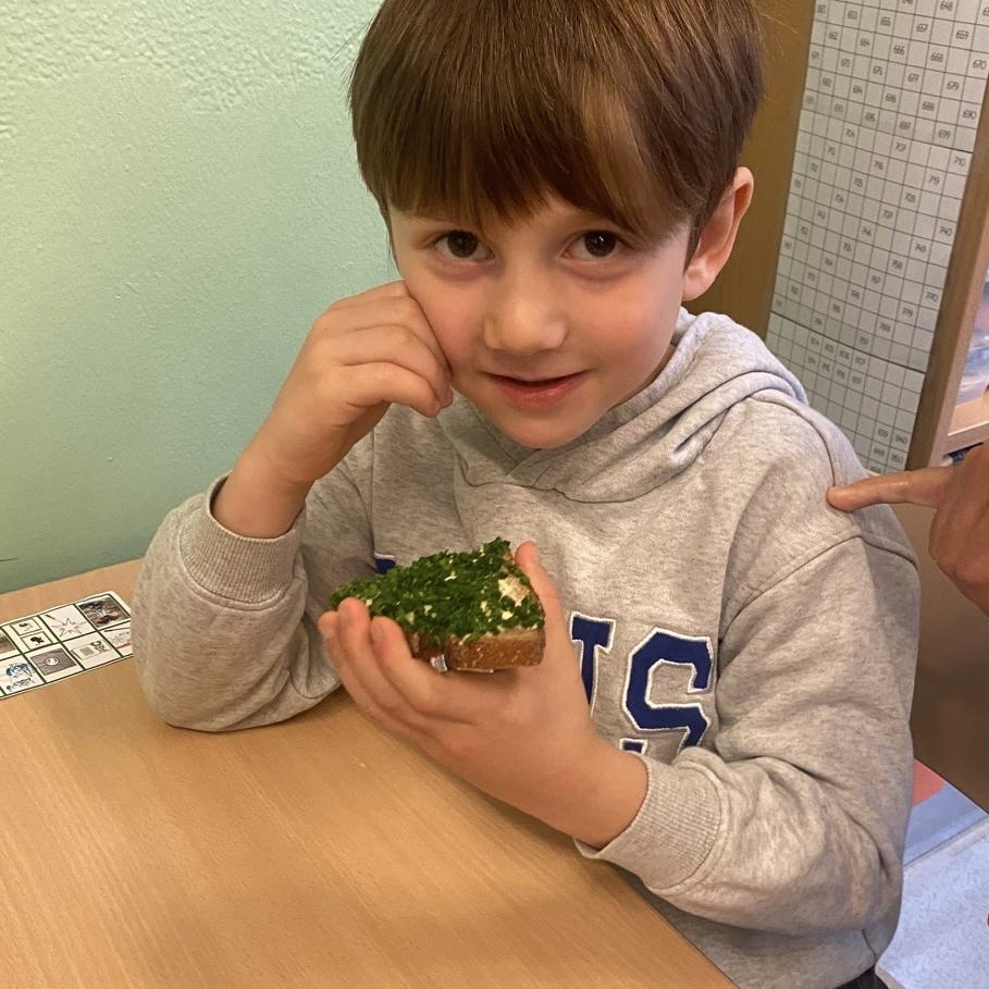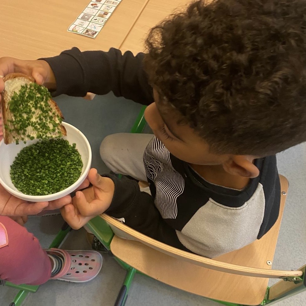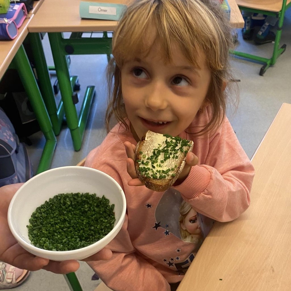Unsere ersten Schultage waren sehr aufregend: Wir haben gemalt, und wir haben viel gelernt. Und wir waren auch schon sehr hungrig: Brote mit Schnittlauch schmecken gut!