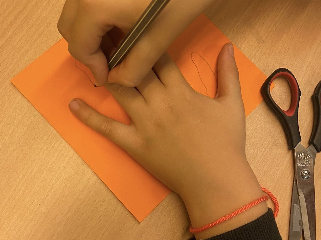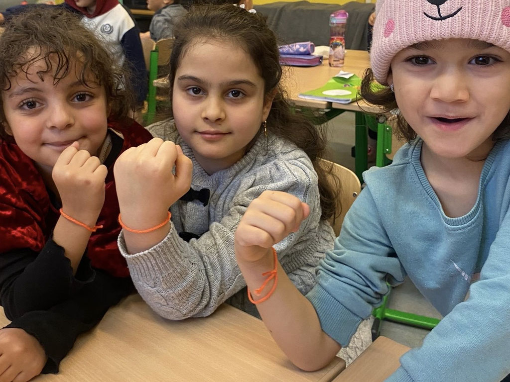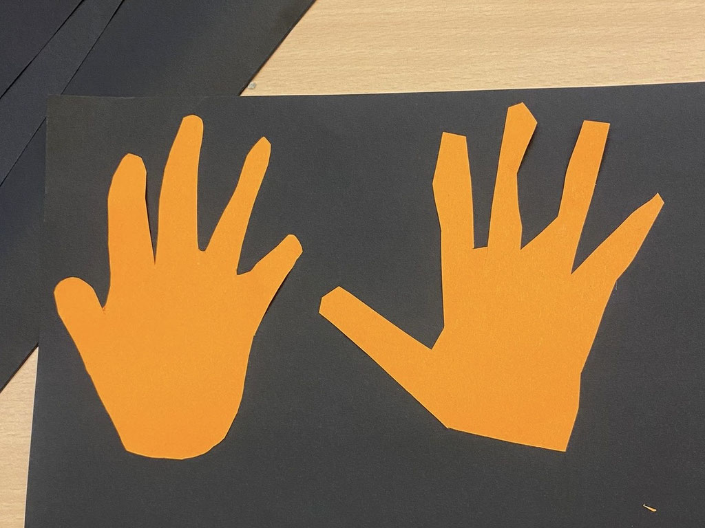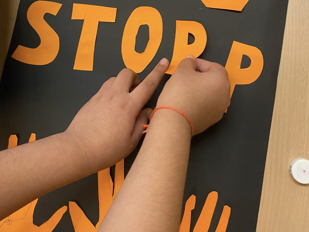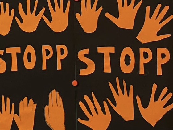 Wenn man anderen Menschen weh tut, ist man sehr gemein. Buben die Mädchen oder Männer die Frauen schlagen, sind besonders gemein. Wir wollen das nicht. Unsere Hände aus orangem Papier sollen sagen: STOPP der Gewalt gegen Frauen!
