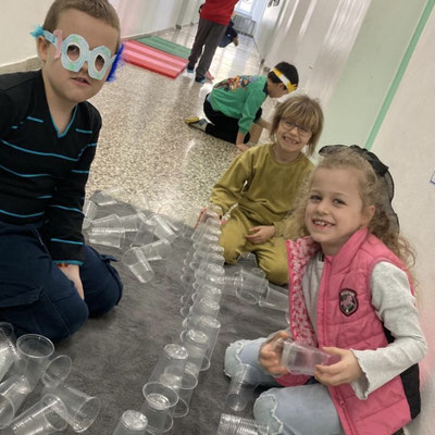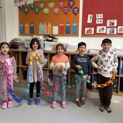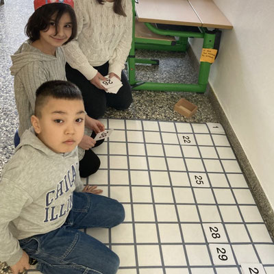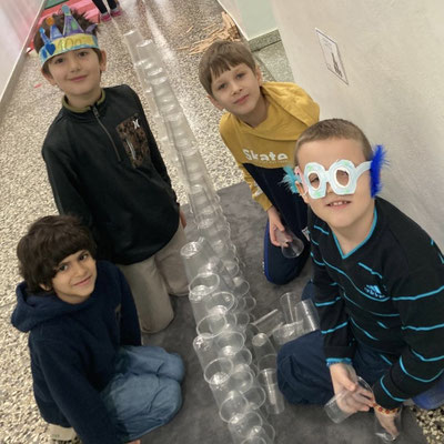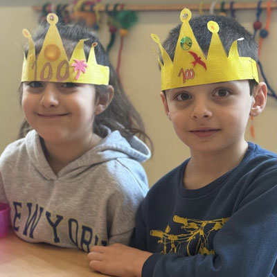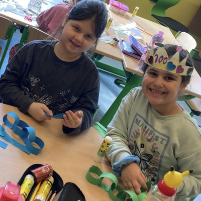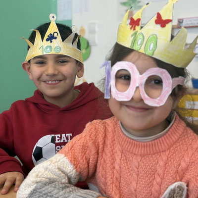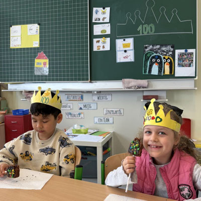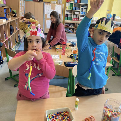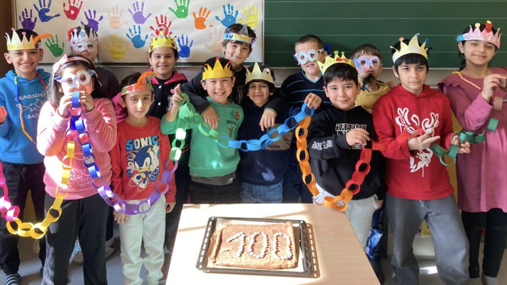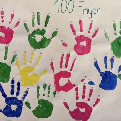 Hurra! Wir besuchen seit 100 Tagen die Schule. Deshalb hat sich heute bei uns überall die Zahl 100 versteckt: