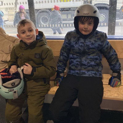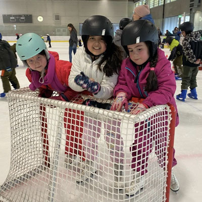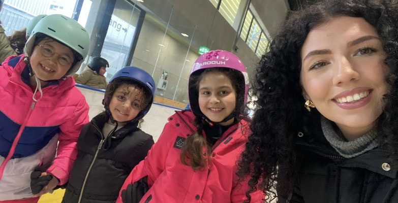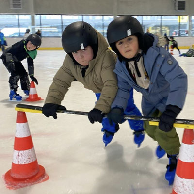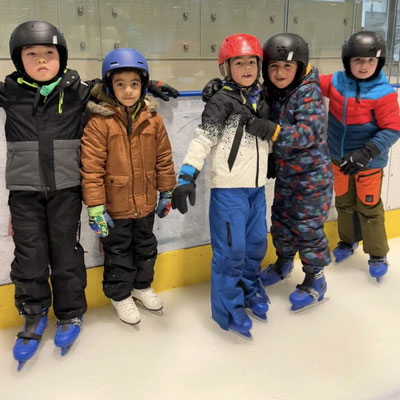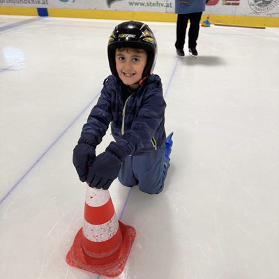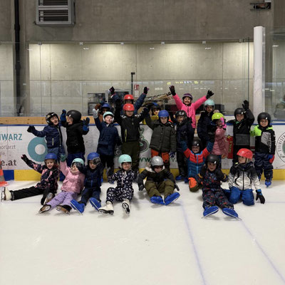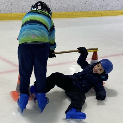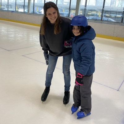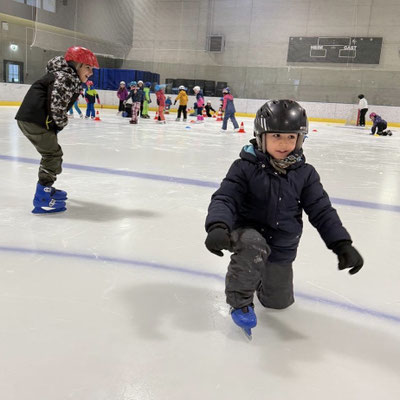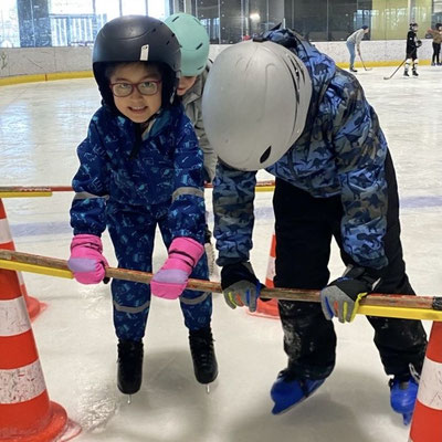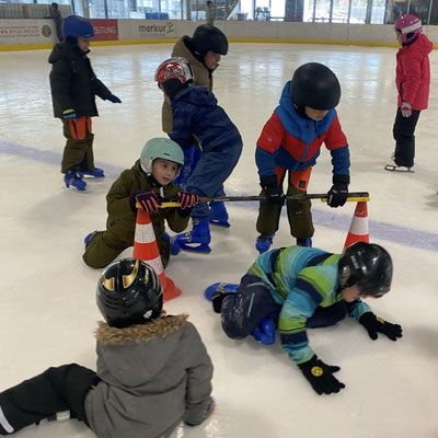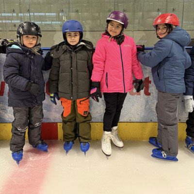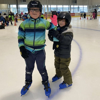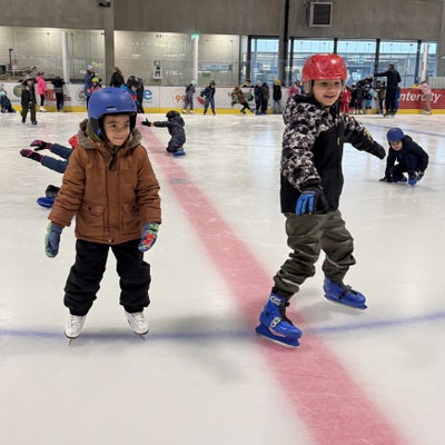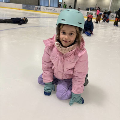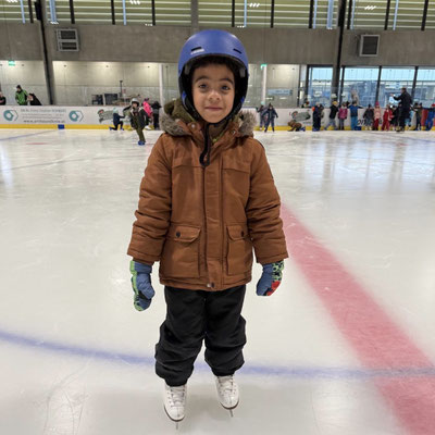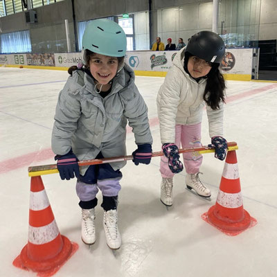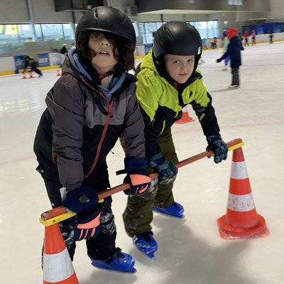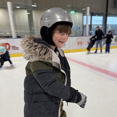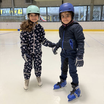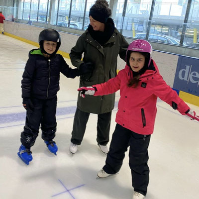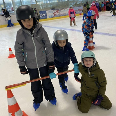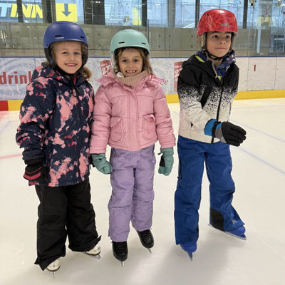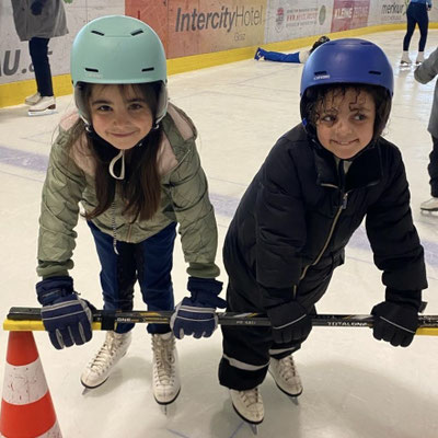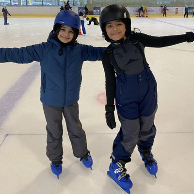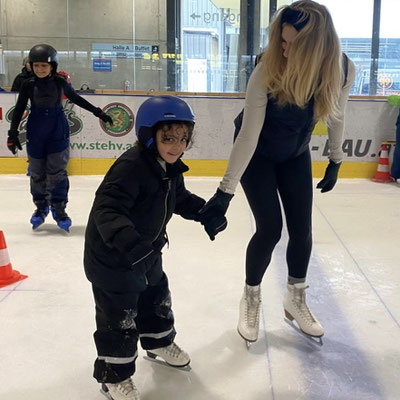 Achtung, auf dem Eis ist es rutschig! Kein Problem: Wir haben ja unsere Eislaufschuhe an! Mit ein bisschen Übung können wir auf dem Eis schon die ersten Runden drehen!