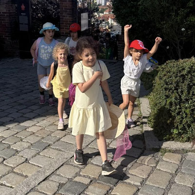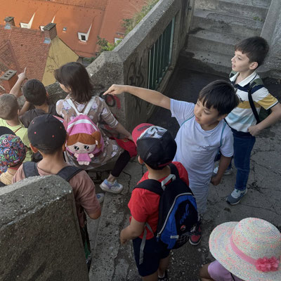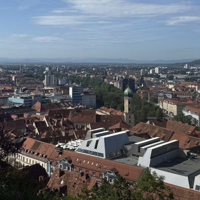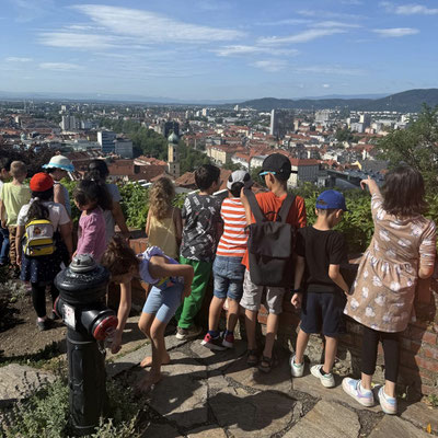 Heute marschieren wir auf den Schlossberg. Da oben haben wir einen schönen Ausblick auf die vielen Häuser der Stadt. Wollen wir auch gleich ein Picknick machen?