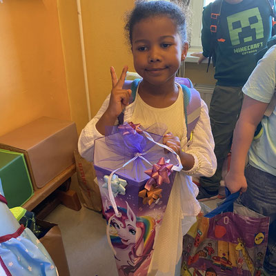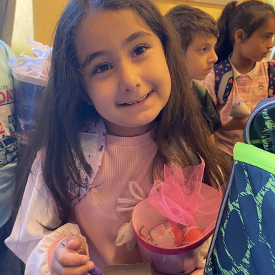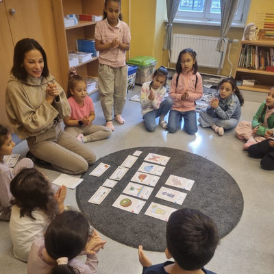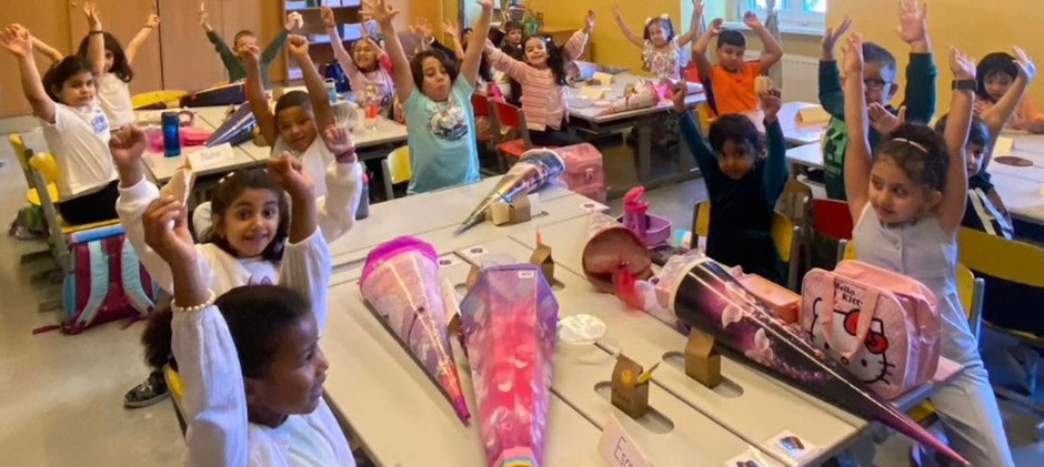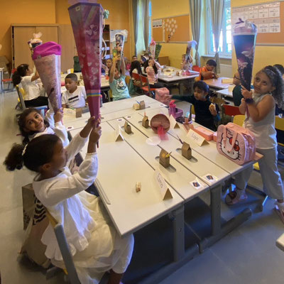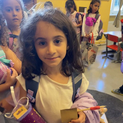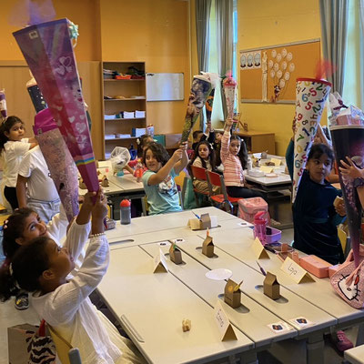 Endlich sind wir in der Schule. Die Schule ist lustig, denn in der Schule lernen wir viel. Wir lernen schreiben und rechnen und noch viel mehr. Momo, das kluge Kamel, wird uns immer gerne dabei helfen.
