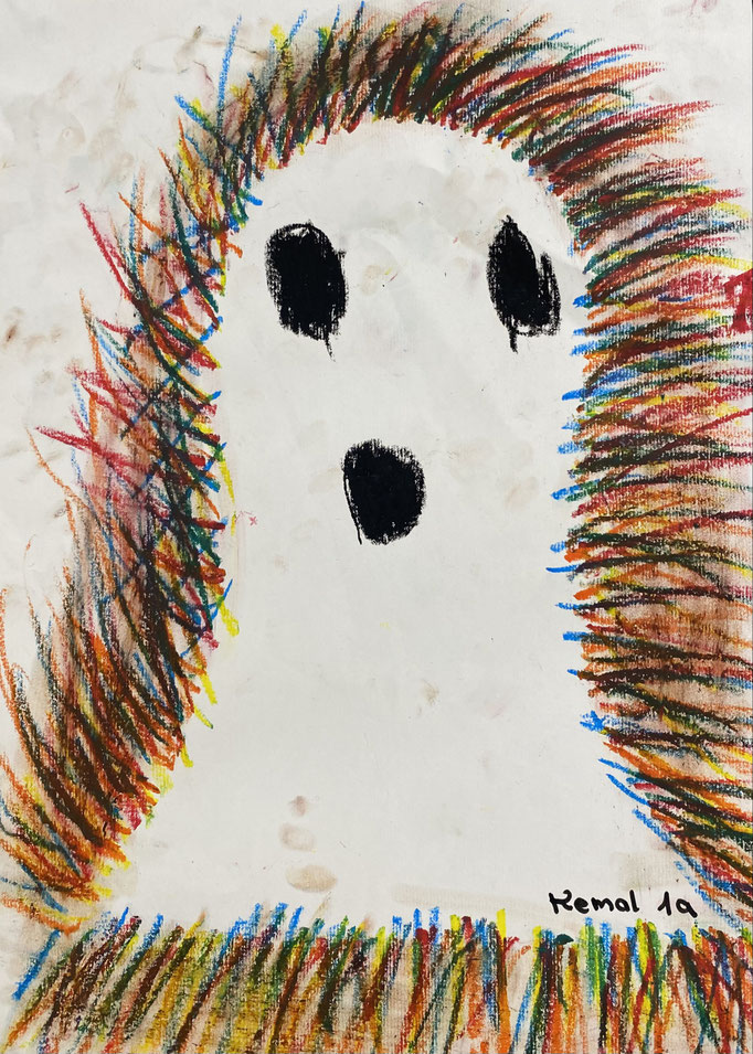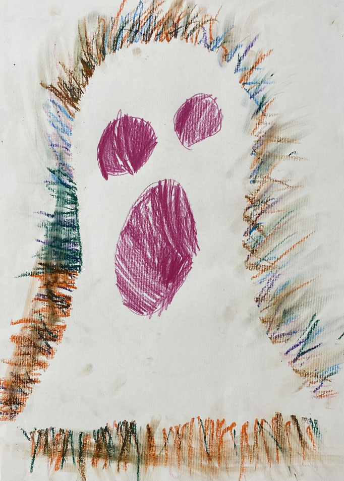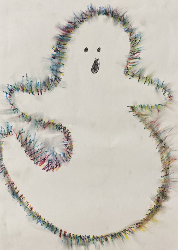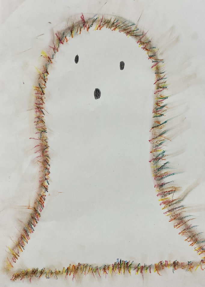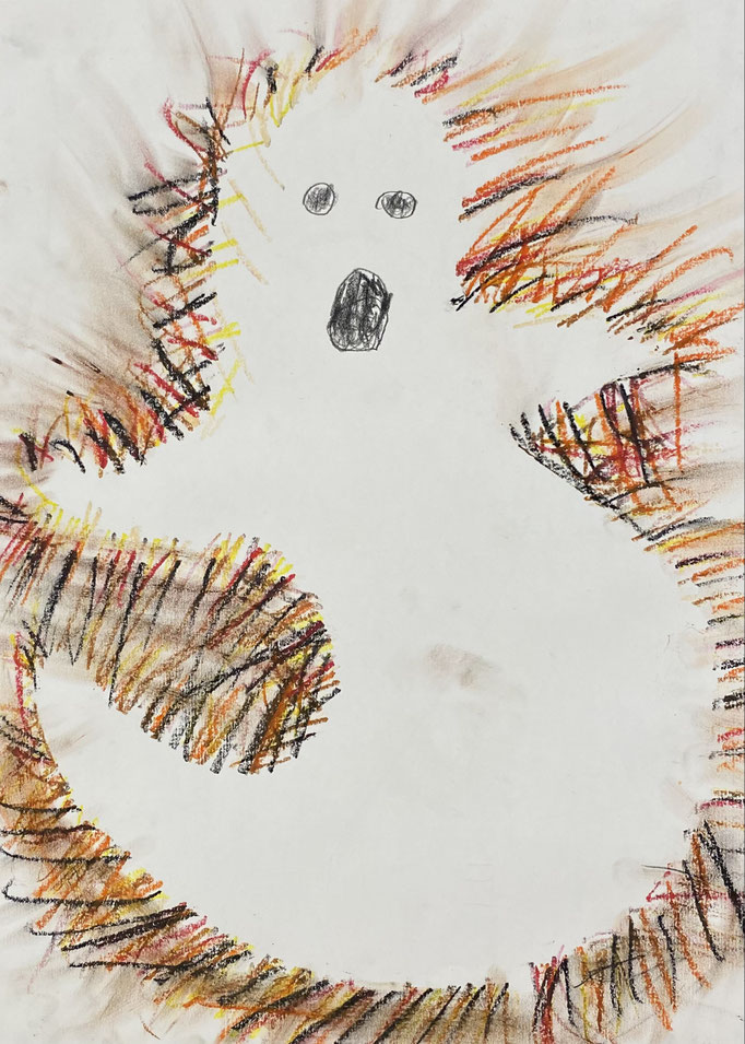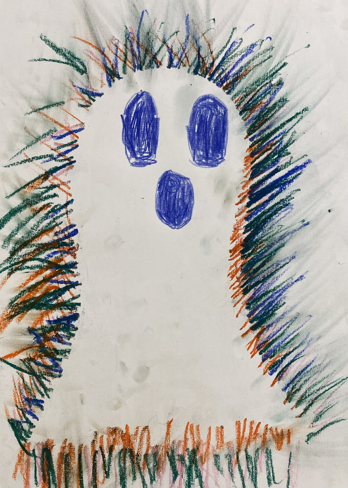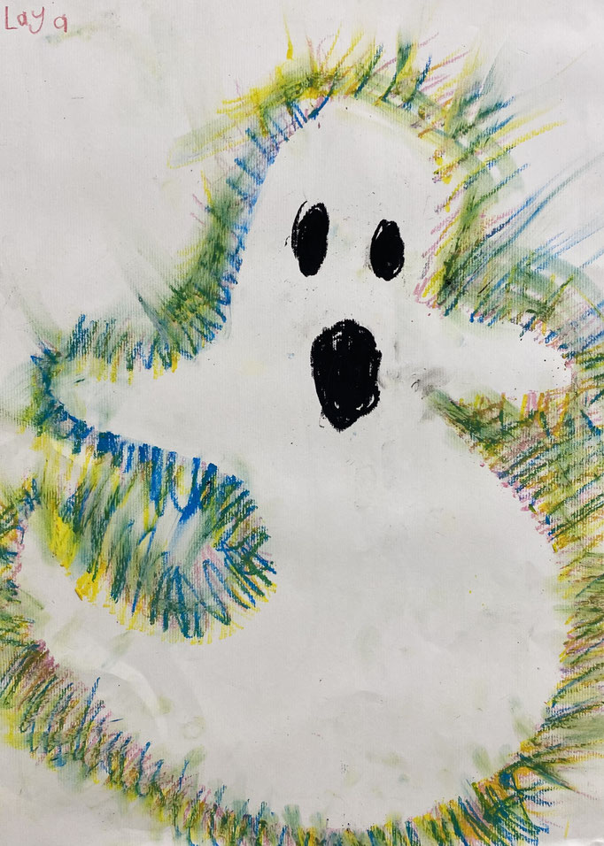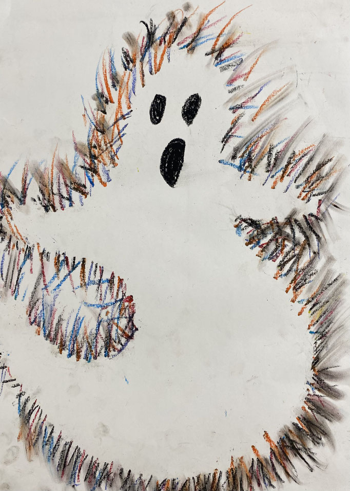 Seid mal ganz leise, dann können wir sie vielleicht hören: es geistert in der Klasse. Wir haben die Form eines Geistes auf ein Blatt gelegt und dann darüber gemalt. Nimmt man die Form wieder weg, ist auf dem Blatt ein Geist entstanden. Uuuuh!