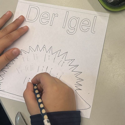 Das Fell von einem Igel hat viele spitze Stacheln. Diese Stacheln sehen aus wie der Buchstabe I. Wenn wir viele I zeichnen, dann bekommen unsere Igel ein dickes Fell.