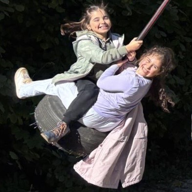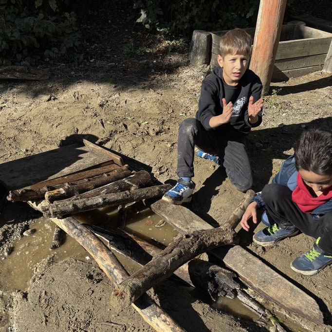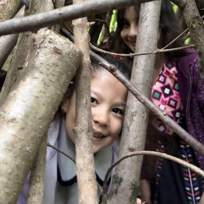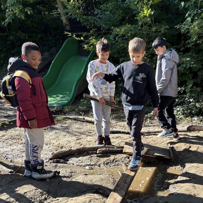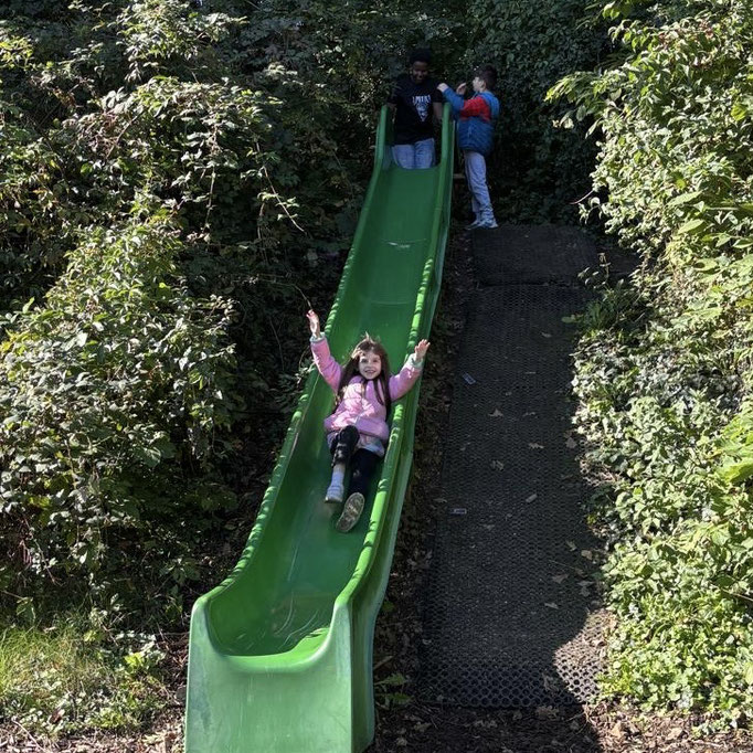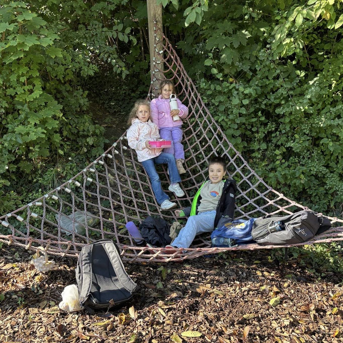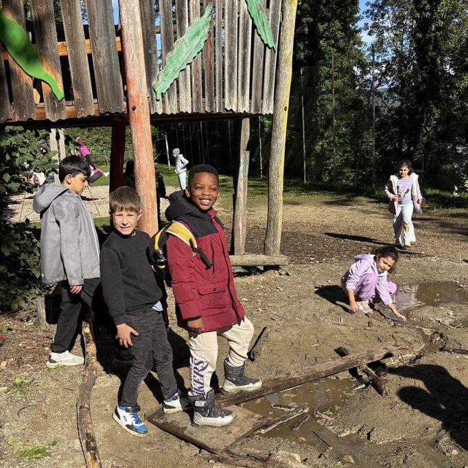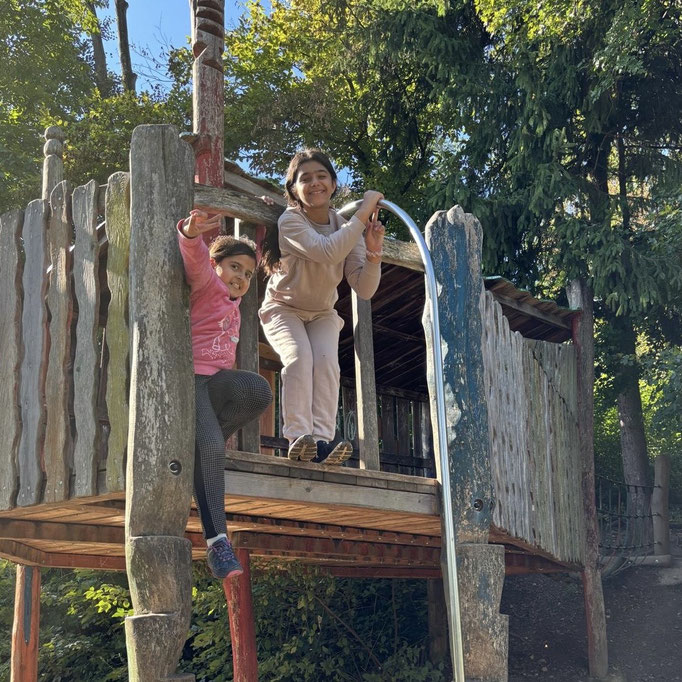 Auf dem Waldspielplatz können wir uns einmal so richtig austoben: das riesige Baumhaus, die lange Rutsche und die große Schaukel laden zum Spielen ein.
