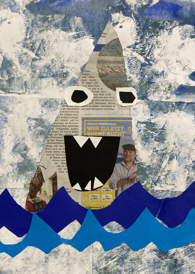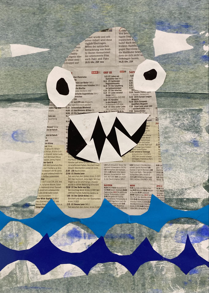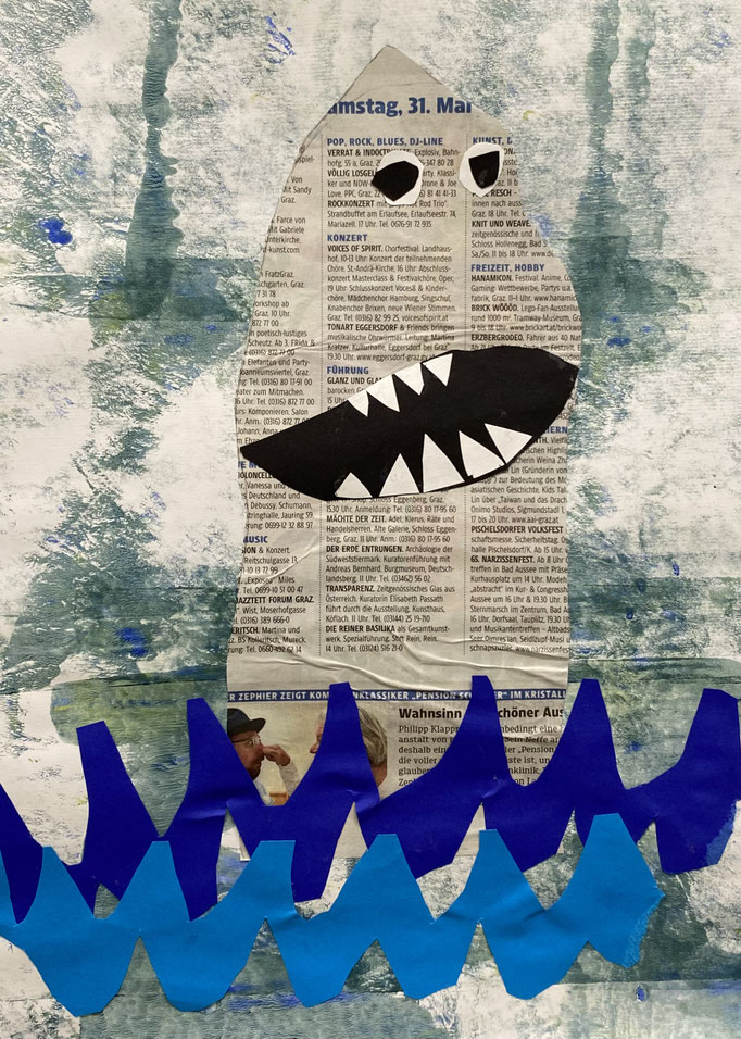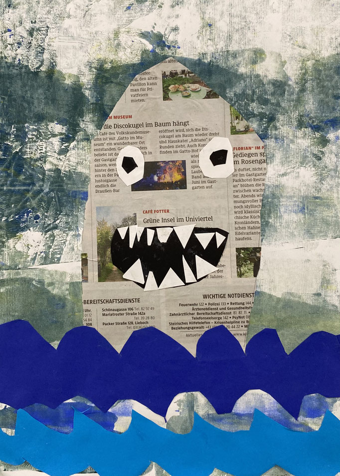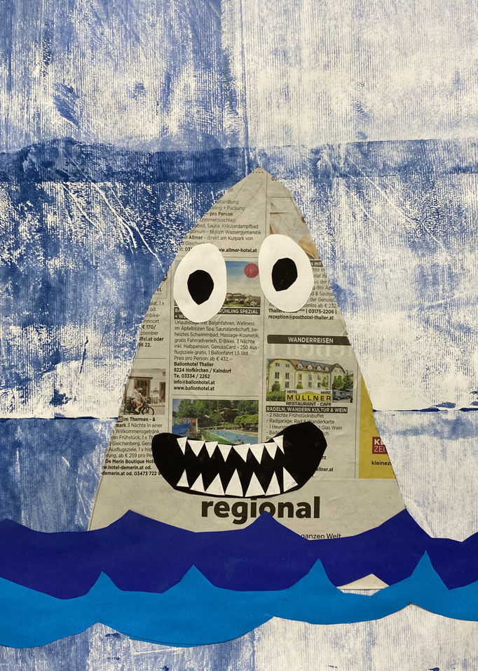 Wir sind zurück aus den Ferien, deshalb sagen wir: Hallo, Ciao, Marhaba, Servus oder Hi! Das Wort Hi klingt wie Hai – also basteln wir uns aus Zeitungspapier gleich ein paar lustige Haifische!