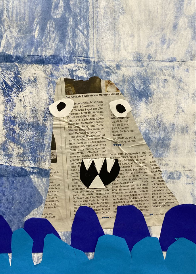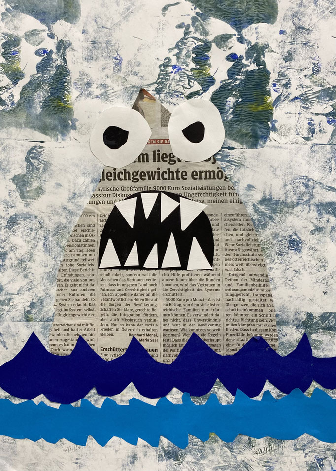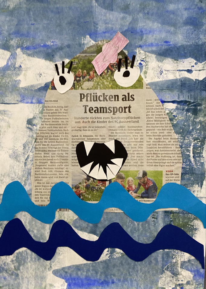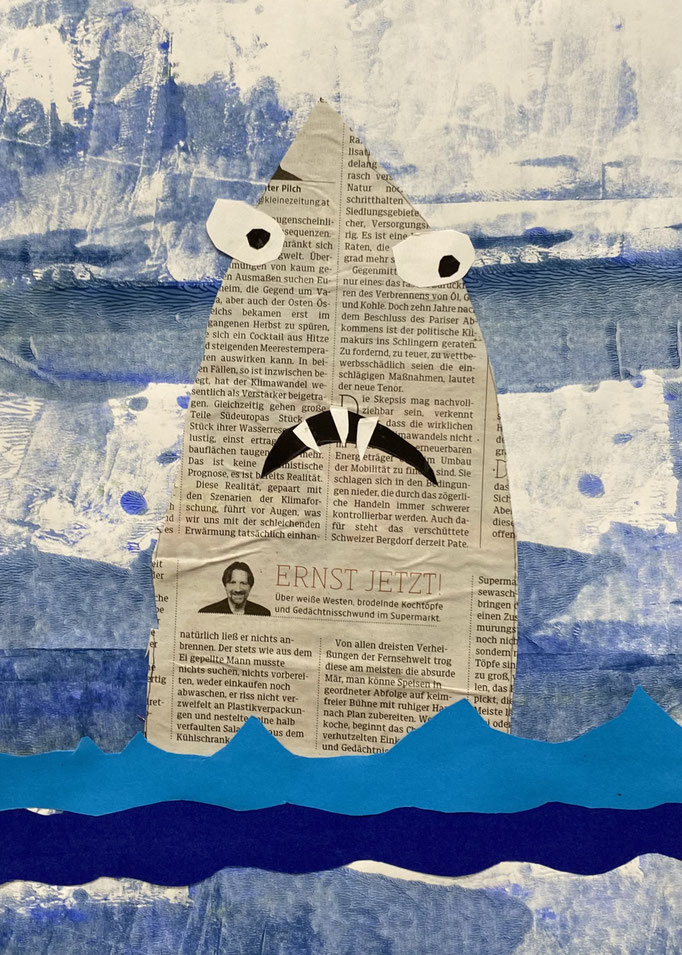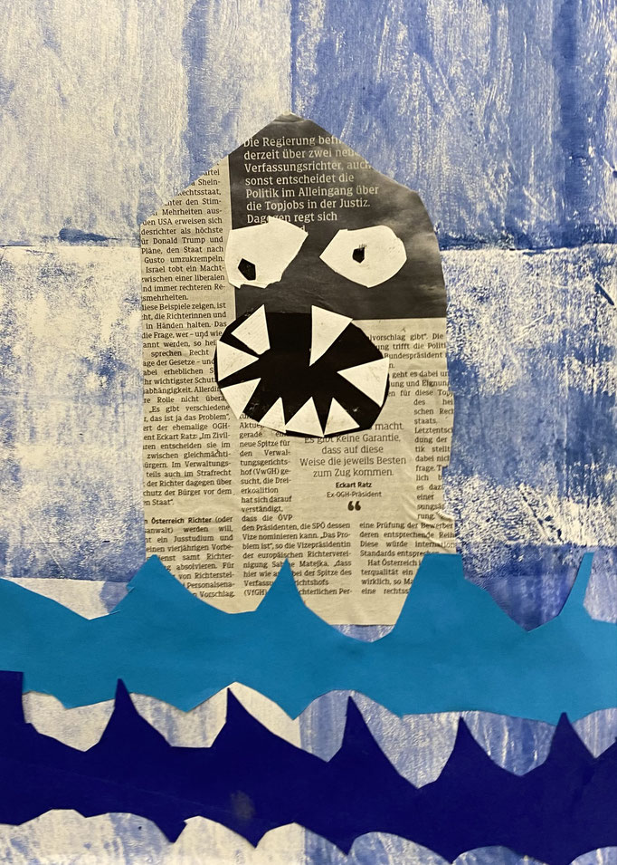 Wir sind zurück aus den Ferien, deshalb sagen wir: Hallo, Ciao, Marhaba, Servus oder Hi! Das Wort Hi klingt wie Hai – also basteln wir uns aus Zeitungspapier gleich ein paar lustige Haifische!