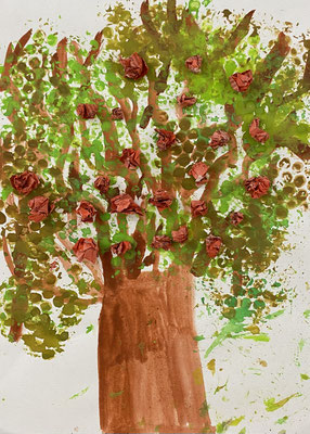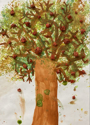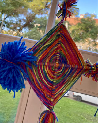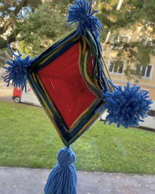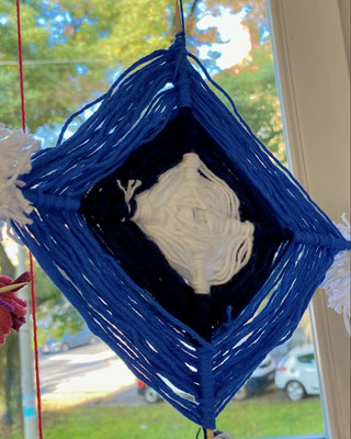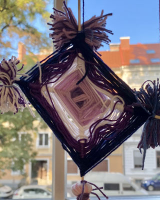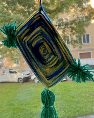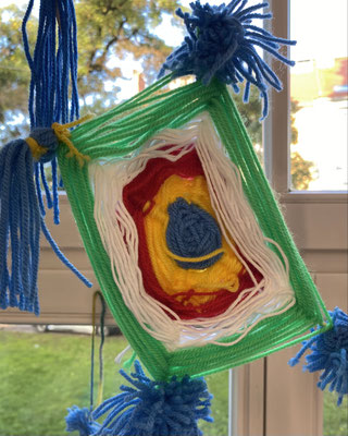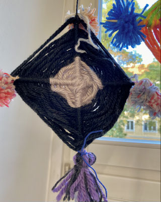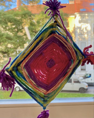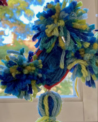Das sind Drachen. Wir haben sie aus bunter Wolle gewebt. Wenn der Wind geht, können wir sie steigen lassen. Ob sie auch fliegen werden?