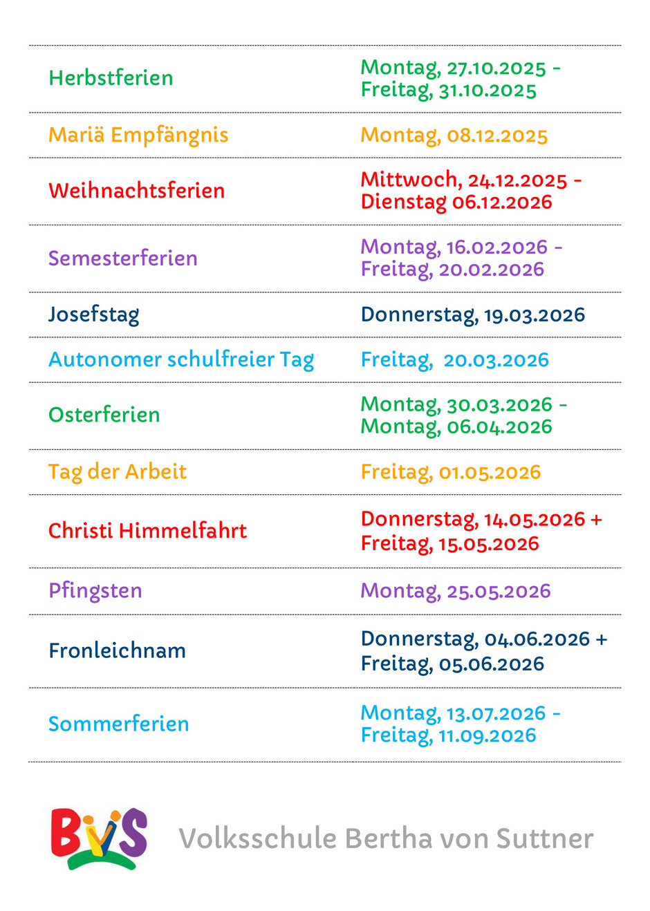 Unsere Ferien und Feiertage im Schuljahr 2025/26: