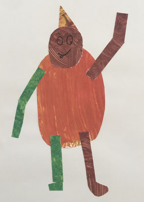 Wir bauen Schneemänner aus Papier, die schmelzen nicht in der Sonne: Der kleine weiße Kreis das ist der Kopf, darauf sitzt ein bunter Hut. Der große weiße Kreis das ist der dicke Bauch. Und um den Hals da tragen sie einen bunten Schal aus Filz.